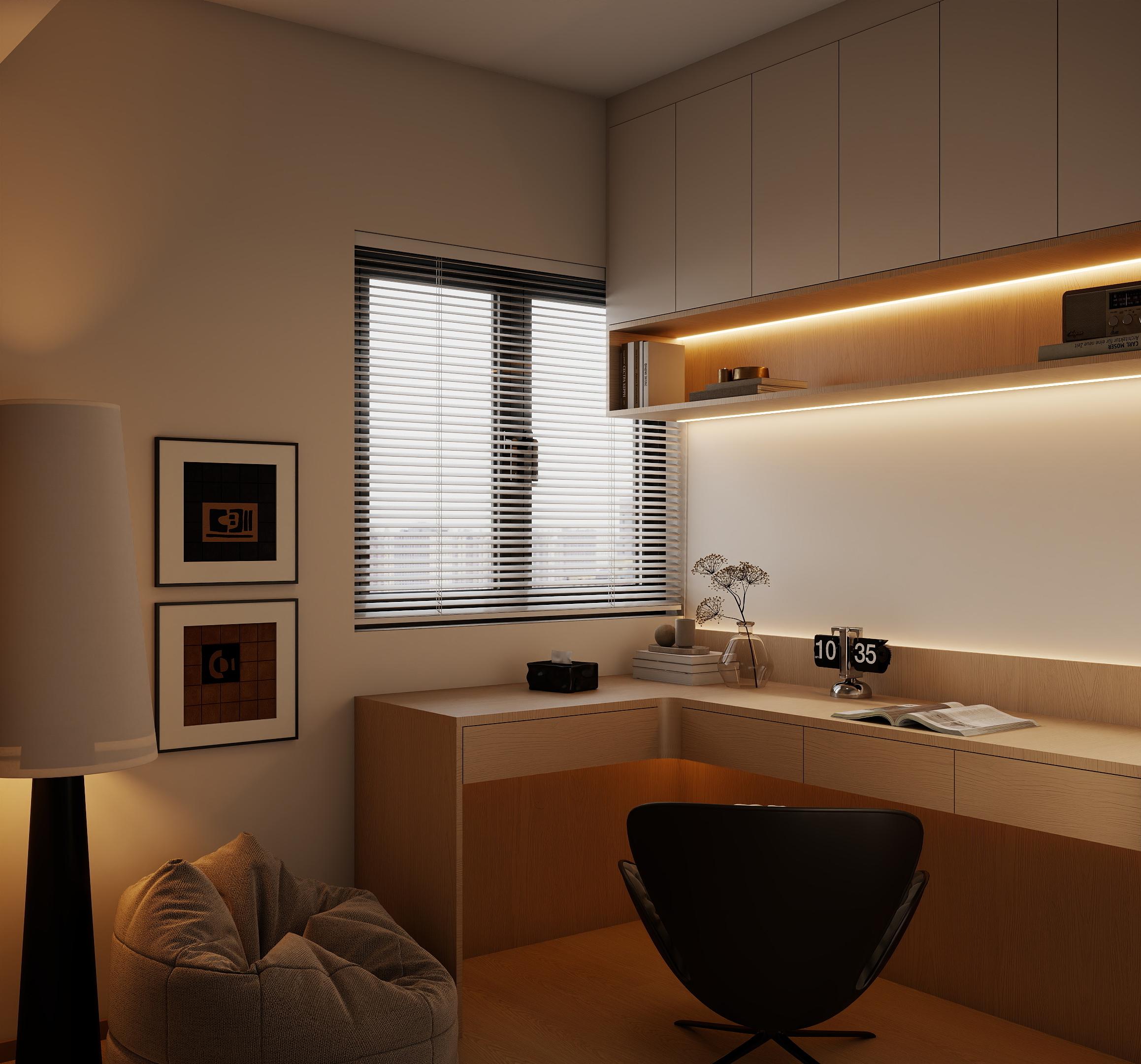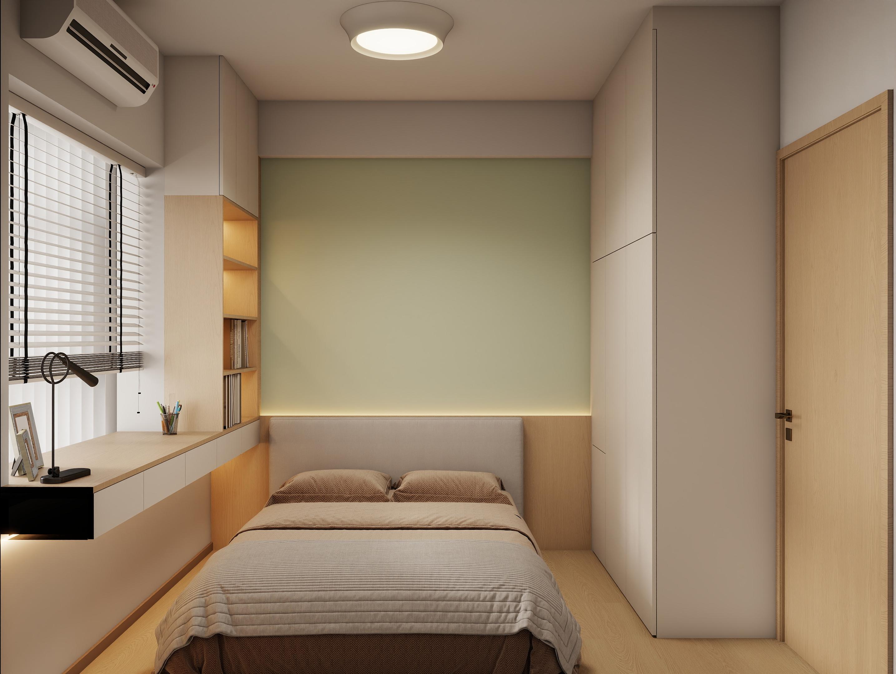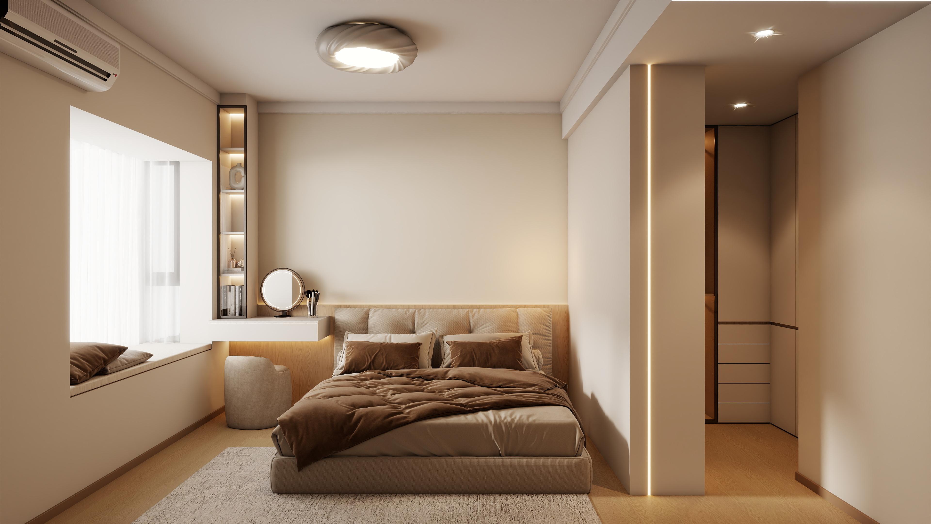 床头一侧设置了白色的梳妆台,兼具收纳和化妆功能,梳妆台上方的开放式搁架可以摆放书籍、装饰品等,飘窗区域设置了软垫和靠枕,提供了一个放松的角落,墙面上的空调和嵌入式的衣柜设计,既实用又节省空间。