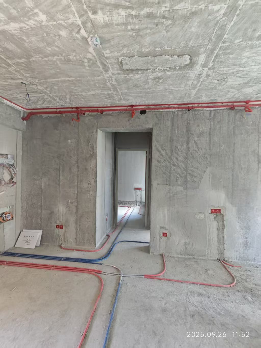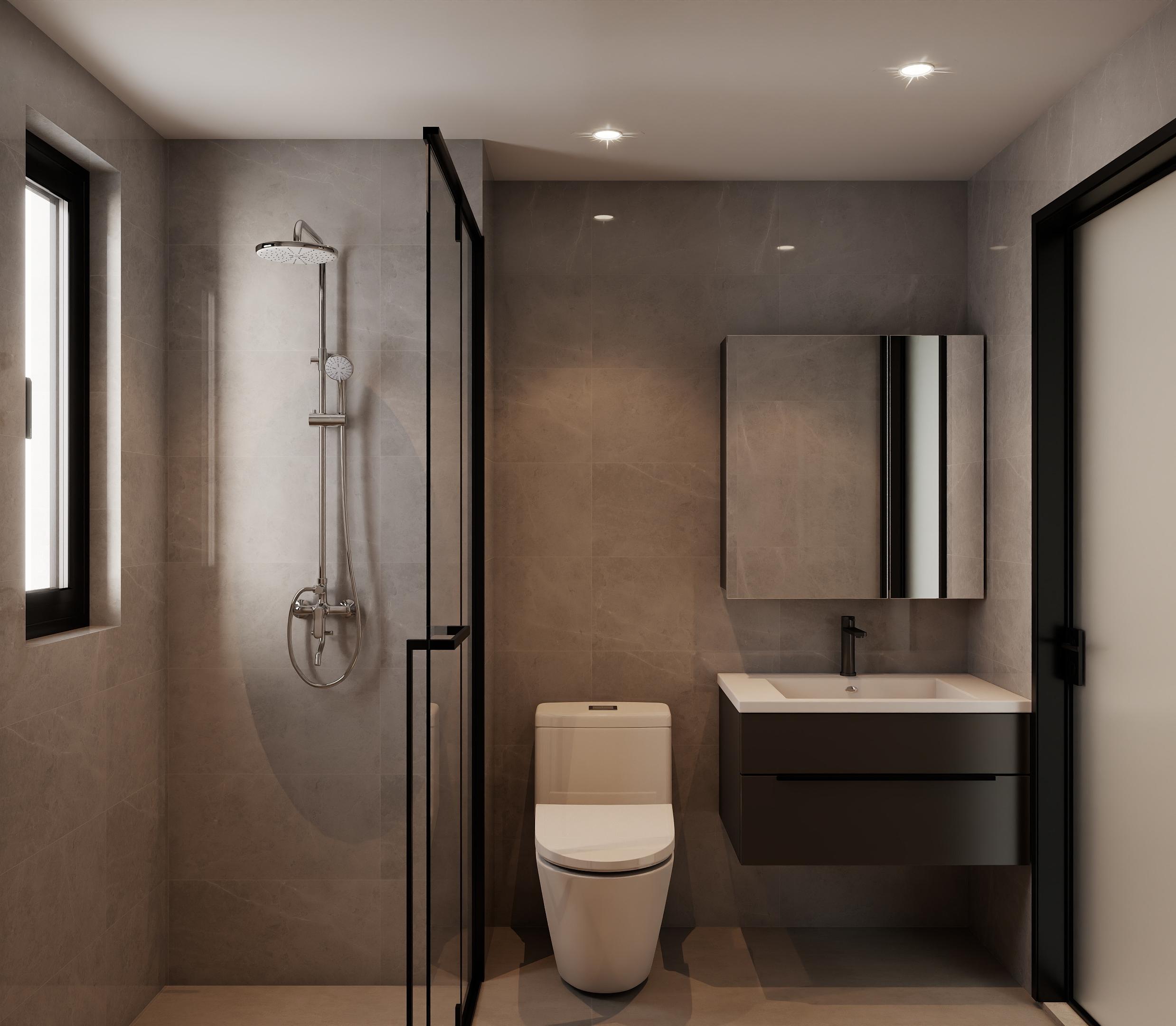卫生间设计简洁实用,采用了灰色瓷砖铺设,显得干净整洁。淋浴区用玻璃隔断分隔,保证了干湿分离。马桶和洗手台的位置布局合理,方便使用。镜柜的设计增加了储物空间,同时使空间显得更加宽敞。