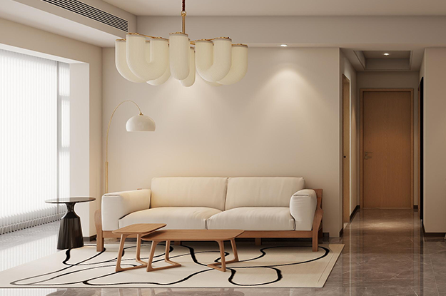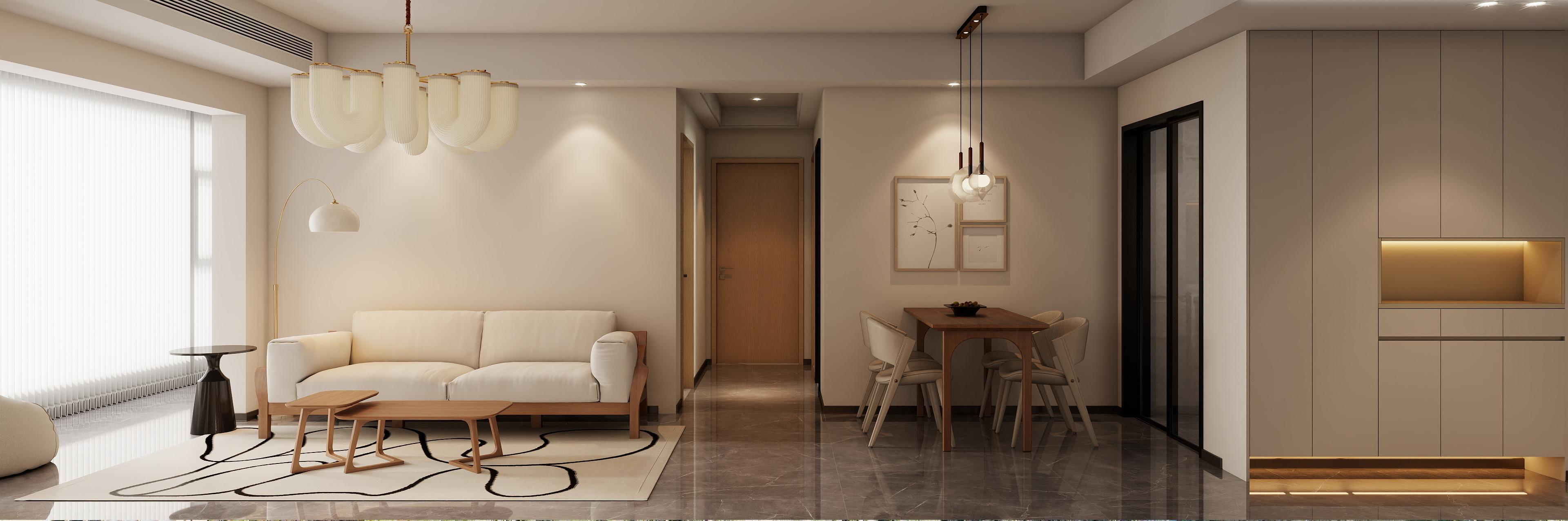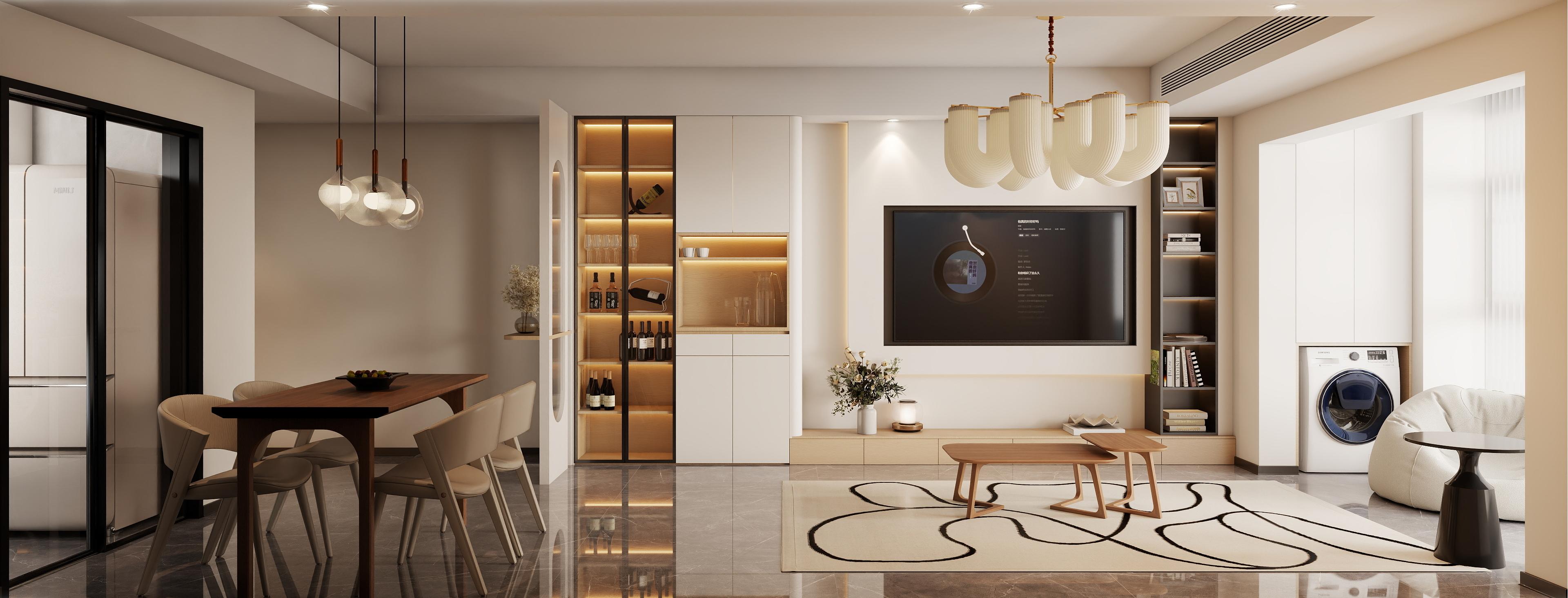 整体色调以米色和木色为主,搭配灰色的瓷砖地面,电视背景墙采用白色与木色的组合,搭配内嵌的灯光,米色的沙发搭配木质的茶几,电视下方的矮柜提供了收纳空间,同时也可以作为展示区,客厅与餐厅之间采用开放式设计,增强了空间的通透感,天花板上的创意吊灯搭配筒灯和射灯