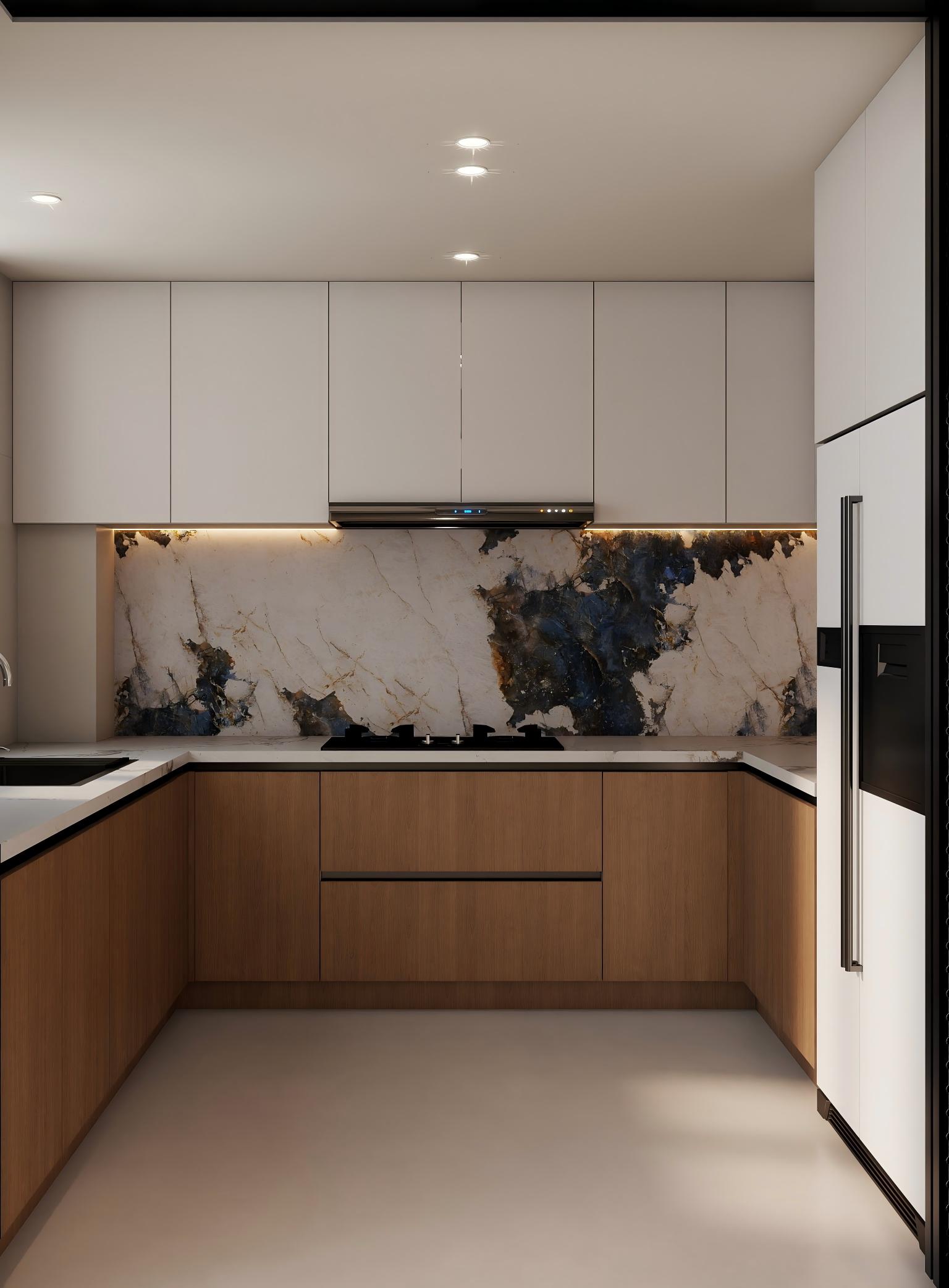 采用白色与木色的经典搭配,简洁明亮。大理石纹理的背景墙提升了厨房的质感和时尚感。