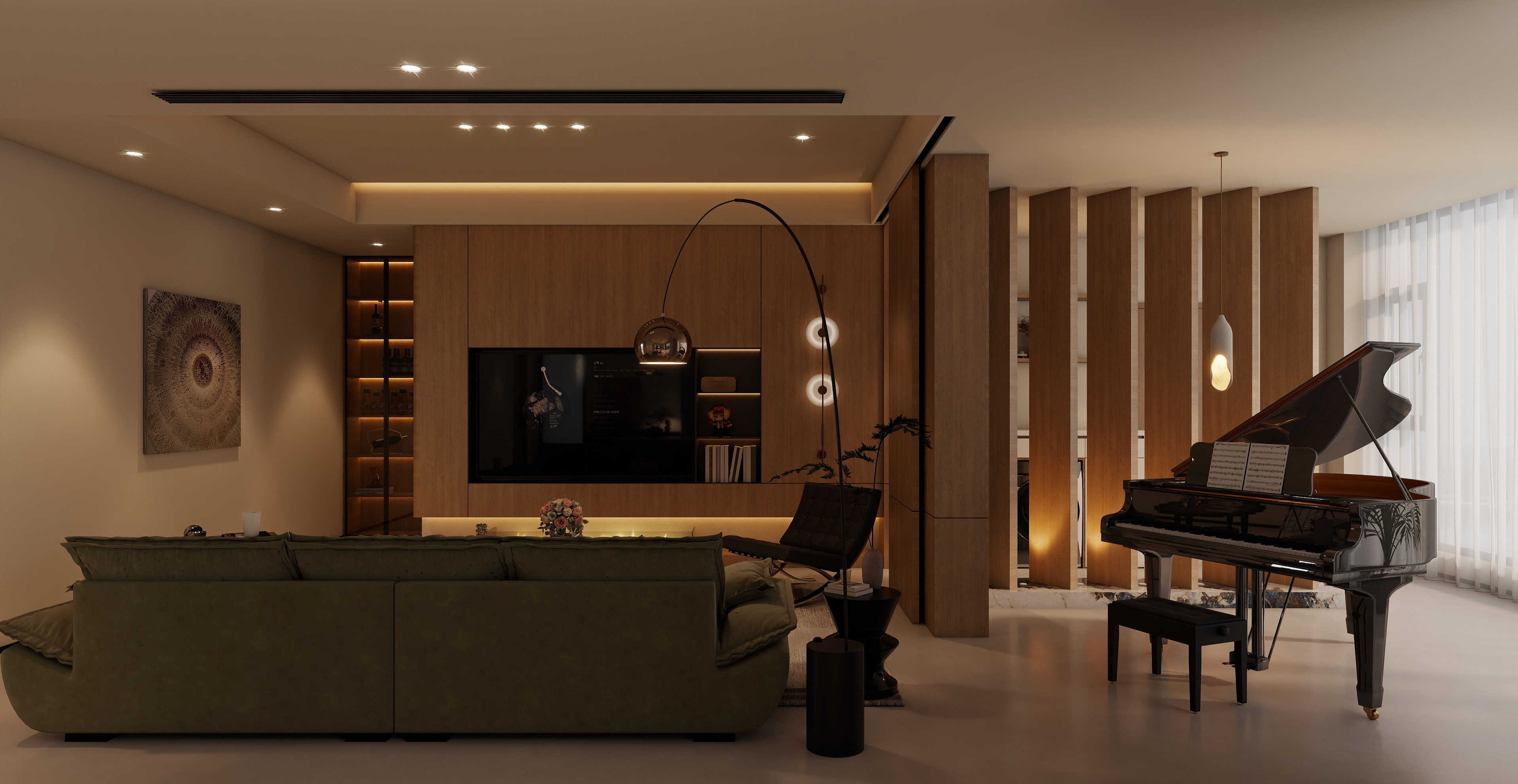 以木质材料为主打造电视背景墙和隔断,带来自然温暖的感觉。深绿色的沙发成为空间中的一抹亮色,与木质的暖调形成对比又和谐统一。