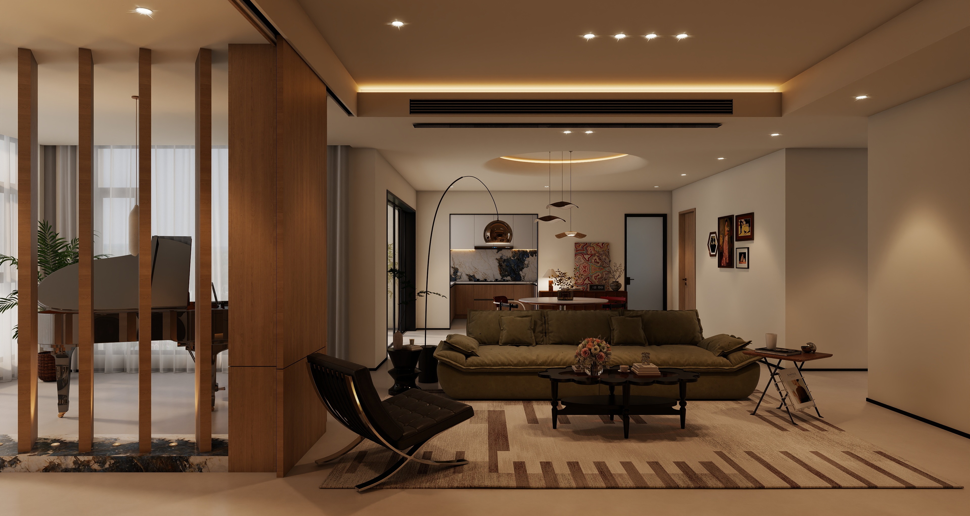 弧形落地灯不仅提供局部照明,还增添了空间的柔和感与艺术氛围。巴塞罗那椅等单品的选择,提升了空间的时尚感和舒适度。