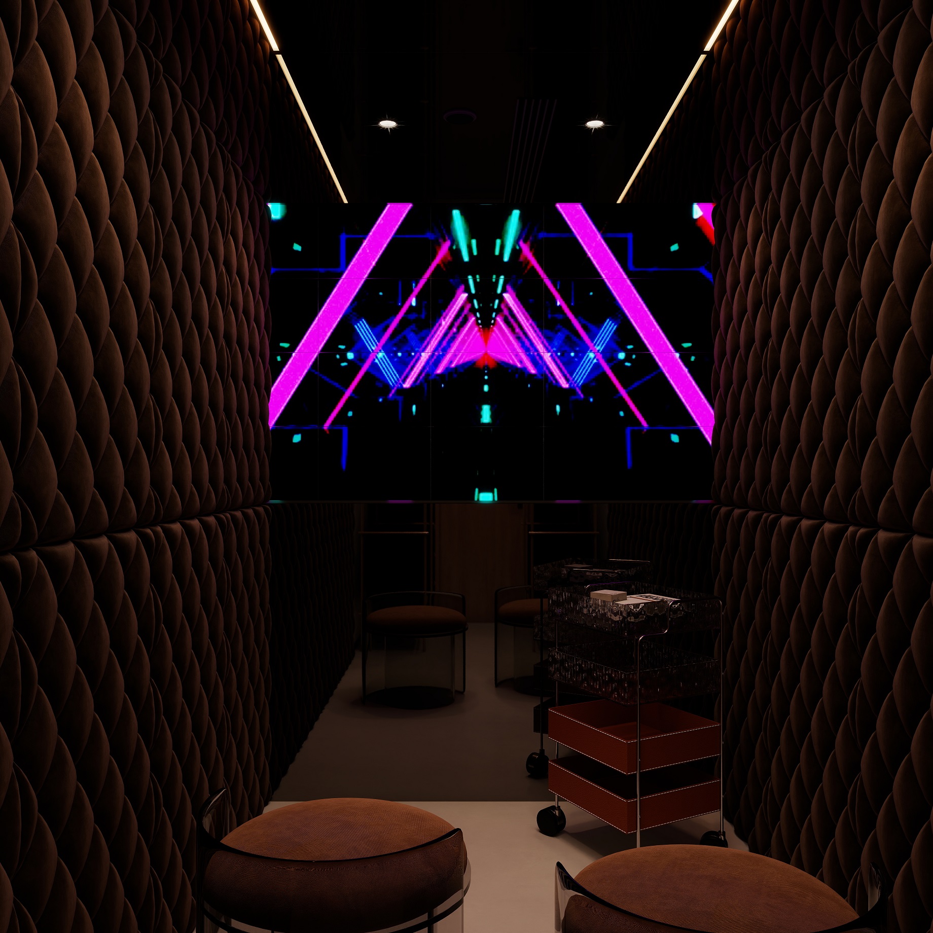 内置隔音棉设成一个小型k歌区域,带有霓虹灯装饰的娱乐室,深色的墙面搭配绚丽的灯光,营造出独特的氛围,可供休闲娱乐。