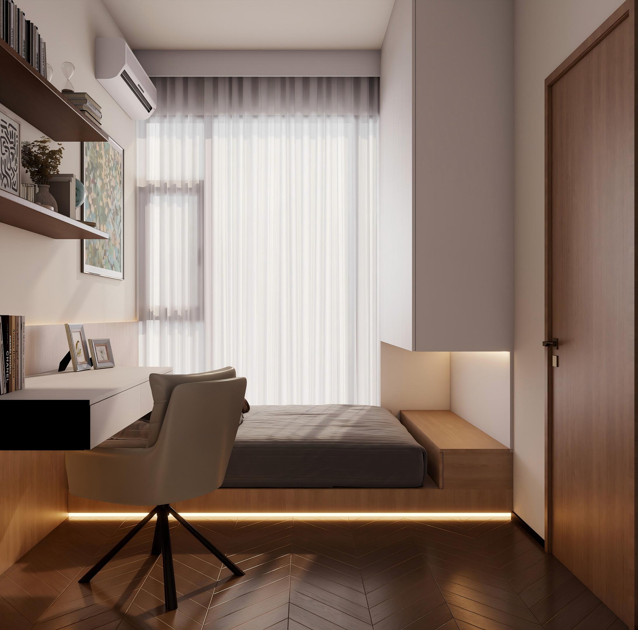 部分卧室设计了书桌区域,满足工作或学习的需求,同时利用墙面空间设置搁架,增加收纳和展示功能。
