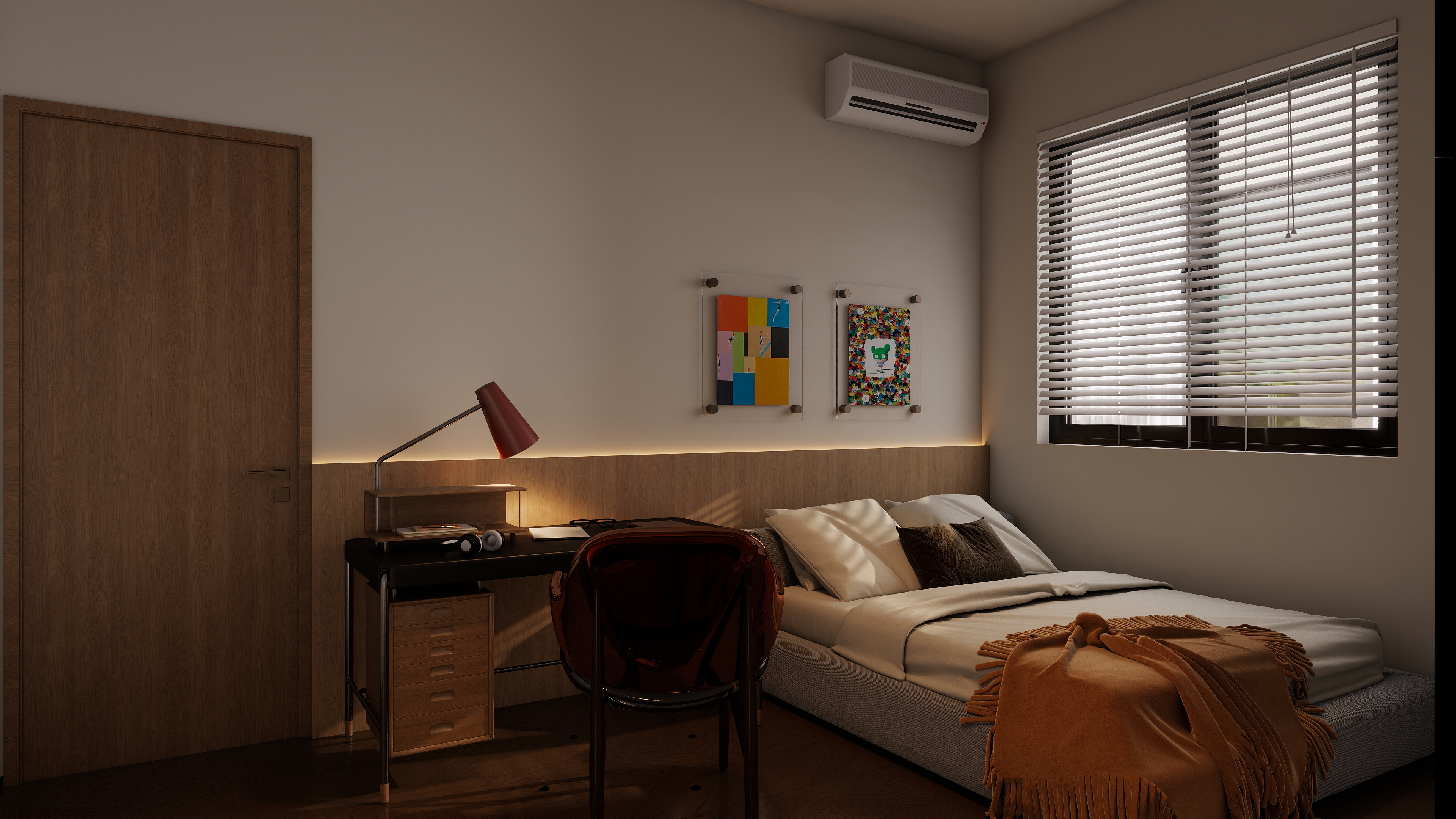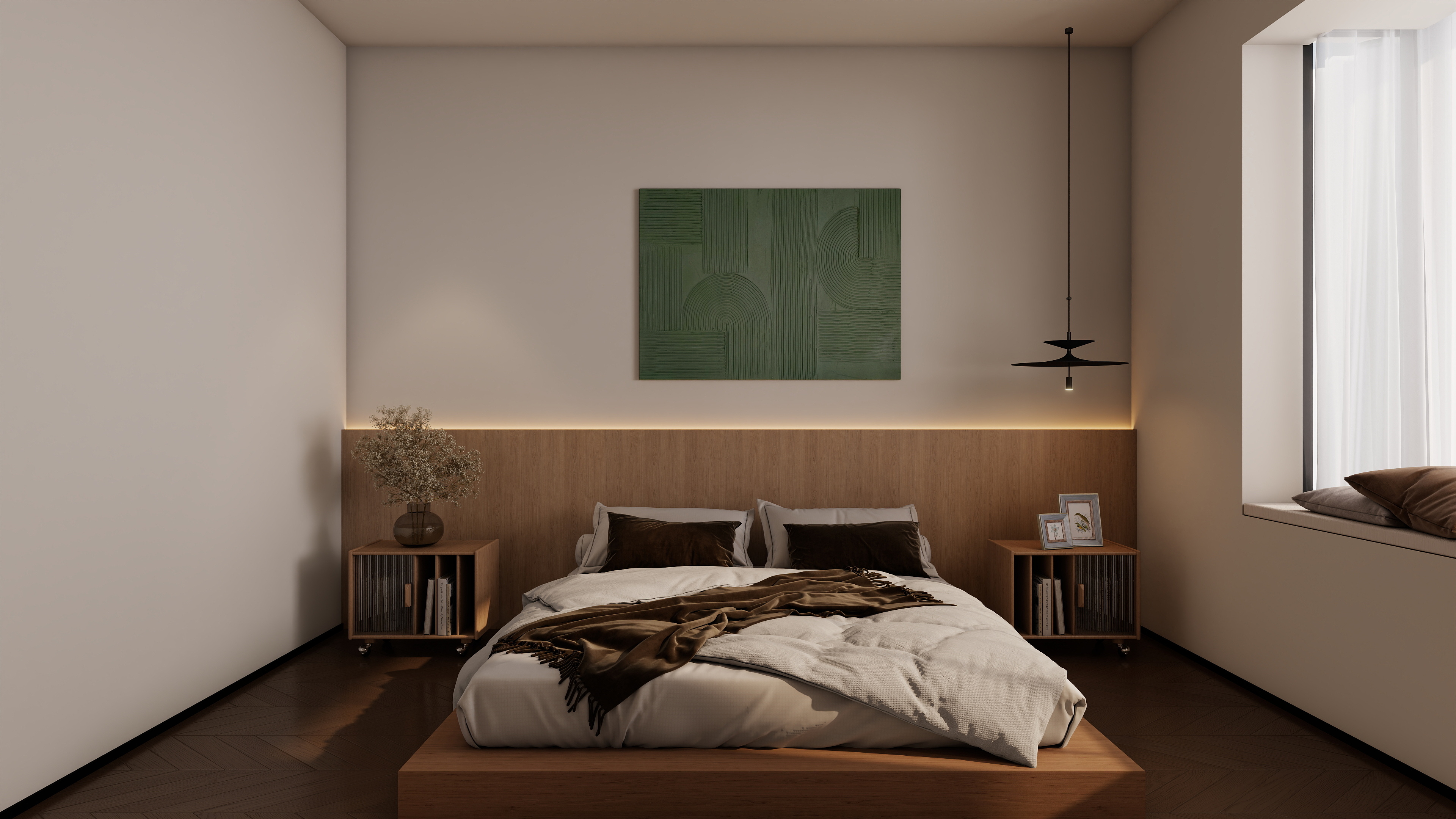 整体色调柔和,以米色、木色为主,营造出宁静、舒适的睡眠环境。床头的艺术画和吊灯,增添了空间的艺术感和温馨感。